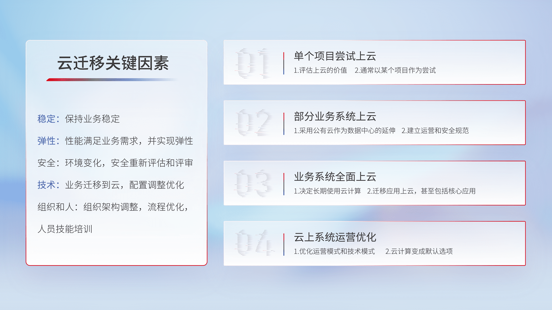 结合实际业务,,,,从规划设计、、云平台选型、、、、云原生改造、、数据迁移、、、、集成交付,,,迁移全过程为客户识别最佳上云路径,,做好风险识别管理,,,,设计网络架构、、、、身份权限、、安全审计合规、、、、操作审计、、日志审计、、、、监控告警策略、、多站点容灾设计等,,,对云上基础设施进行整体规划,,,,提升IT治理水平,,,以满足弹性、、高可用、、、、高性能的需求。。。