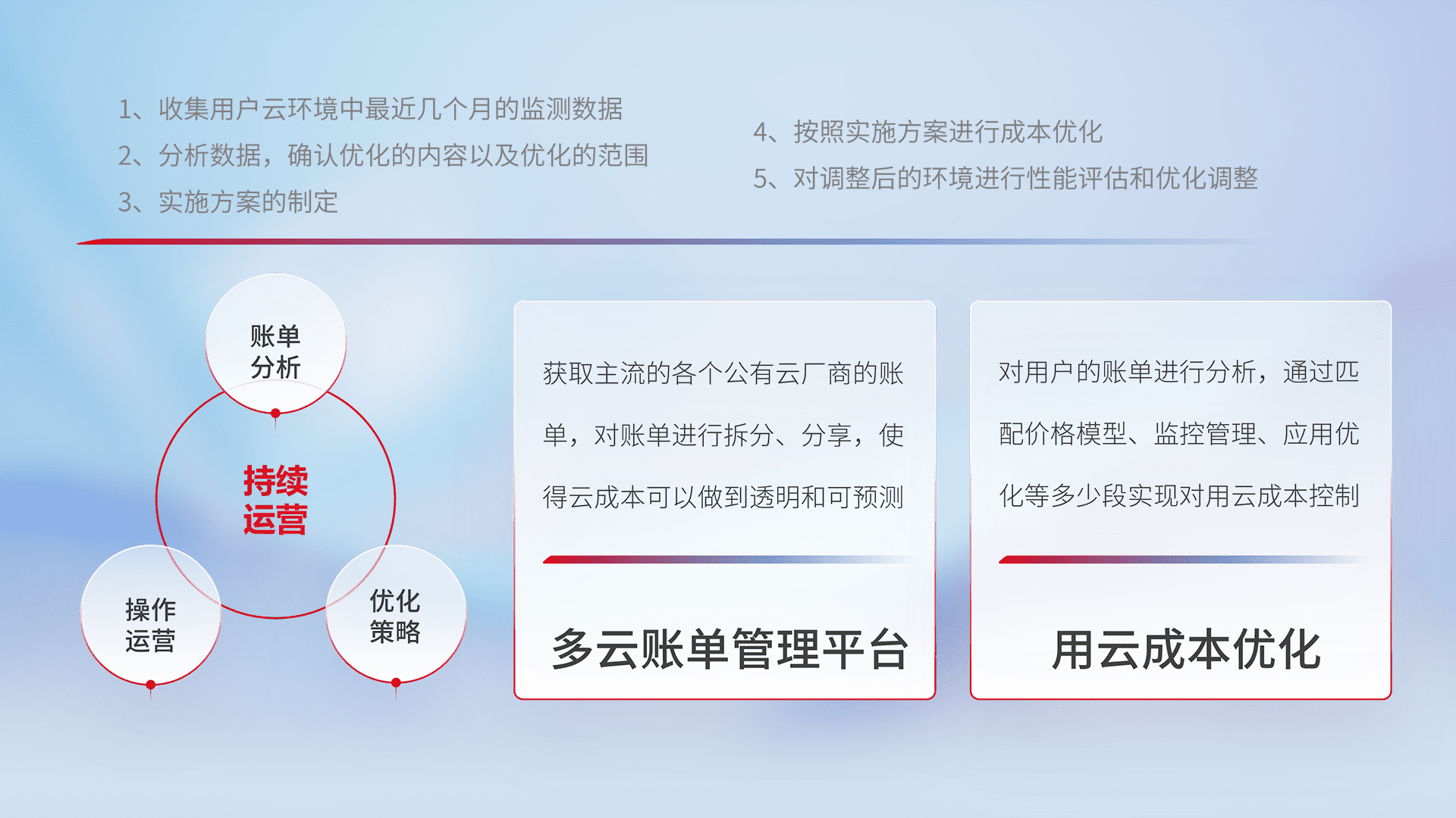 通过多云纳管,,,,以统一的资源数据模型把客户的云资源进行抽象和封装,,,,进而实现对多云资源的统一操作,,,保障云资源管理的可靠性、、、稳定性与可用性。。量身定制化运维内容,,,配置、、、开发运维、、、补丁管理、、、备份、、、监控、、、认证和访问管理、、、审计和日常巡检等,,,保障在用云过程中的可靠度,,稳定度以及高可用率。。。。
