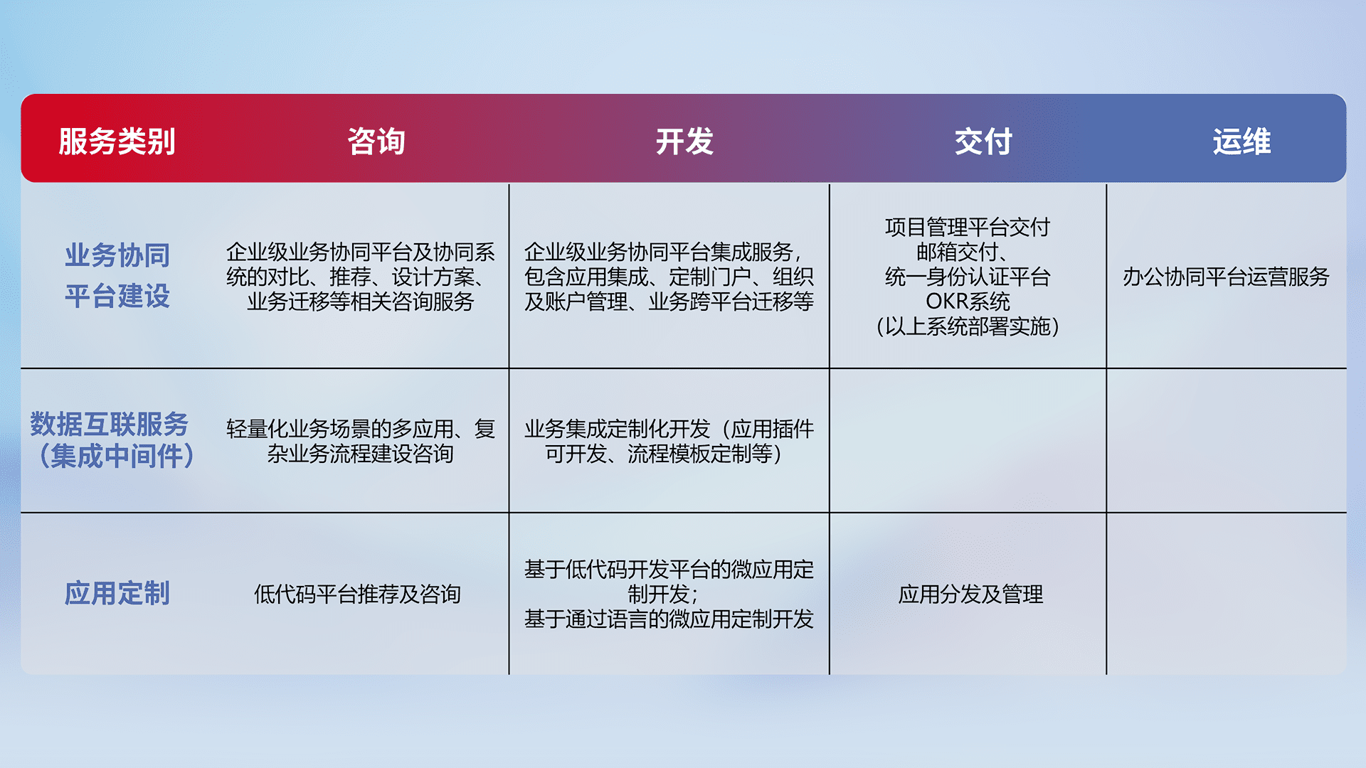 针对钉钉、、、、企微、、、、IDaas等平台级产品提供产品的规划、、方案、、交付、、、定制化开发等服务,,实现如统一协同办公、、、智能客户服务、、混合会议管理、、、智能数据查询、、、、等业务场景,,,,实现数字化转型。。。。